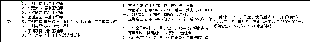 *海同学,24岁,湖南理工学院机电一体化本科毕业,工作经验一年。本次他共面试了8家企业,被其中6家企业录取,经过考虑他选择了大族激光电气工程师一职,转正工资7500元,并有500元生活补贴,出差及加班费另算。