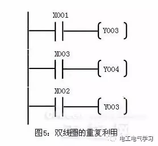 四,不宜使用双线圈输出。若在同一梯形图中,同一组件的线圈使用两次或两次以上,则称为双线圈输出或线圈的重复利用。双线圈输出一般梯形图初学者容易犯的毛病之一。在双线圈输出时,只有最后一次的线圈才有效,而前面的线圈是无效的。这是由PLC的扫描特性所决定的。