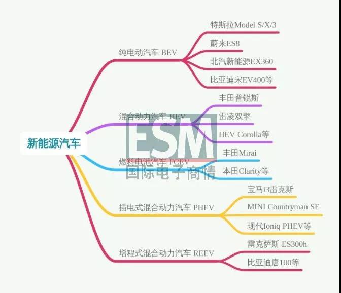 图1 市面上流行的新能源汽车种类及代表车型 制图:国际电子商情