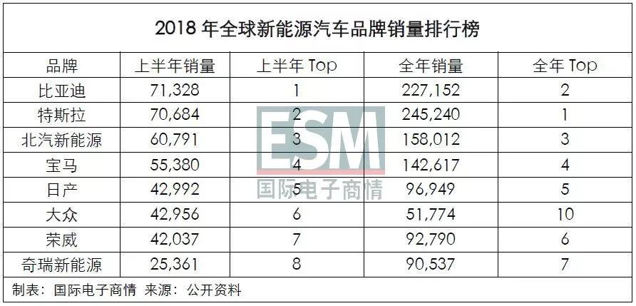 截止发稿日,仍有部分车企尚未公布2018年新能源汽车具体销量数据。不过本文汇整了2018年上半年全球新能源汽车品牌销量排行版数据,有兴趣的读者可以参考。根据榜单可知,全球电动汽车在2018年1-6月累计销量达76万辆,比亚迪、特斯拉、北汽新能源、宝马、日产、大众、荣威、奇瑞新能源的销量列入2018年上半年Top 8。