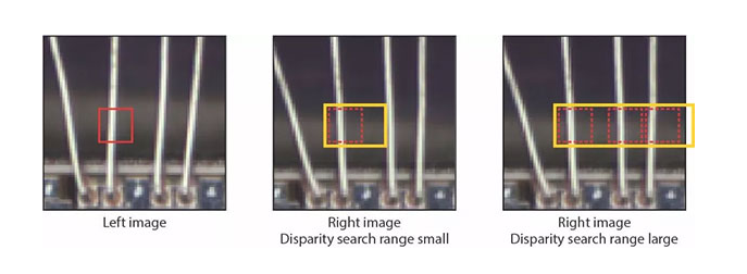 注意,中间图像中相当小的视差搜索范围仅包括一条线,即与参考块匹配的线。相反,右侧图像中显示了具有覆盖多条线的视差搜索范围的情况,其中块匹配可能由于模糊的对应而失败。