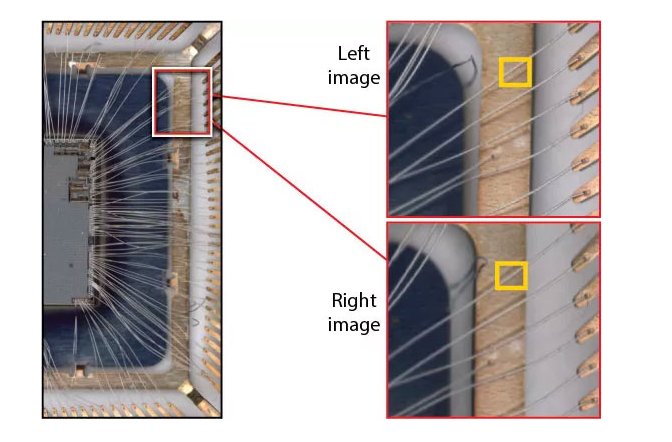 3D立体成像技术通常用于焊线(bonding wire)检查,但存在许多挑战。其中挑战之一是难以使用块匹配算法来解决对应问题,因为某些焊线可能具有无纹理的水平结构。对于这样的对象,对应搜索可能失败或执行低效,因为算法的图像内容对于水平方向上的多个块是相同的。