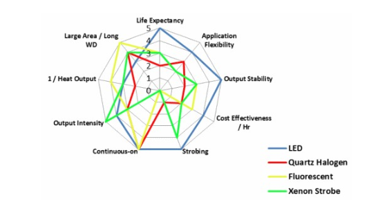 荧光灯,石英卤素灯和LED是机器视觉中使用最广泛的照明类型,特别是对于中小型检测站。 金属卤化物,氙气和高压钠更典型地用于大规模应用或需要非常明亮光源的区域。 金属卤化物,也被称为汞,经常用于显微镜,因为它有许多离散的波长峰,这补充了荧光研究的过滤器的使用。 氙气灯对于需要非常亮的频闪灯的应用非常有用。 图2显示了应用于机器视觉的荧光灯,石英卤素灯和LED照明类型以及相关选择标准的优缺点。 例如,尽管LED照明具有更长的寿命,但石英卤素照明可能是特定检查的选择,因为它提供了更大的强度。