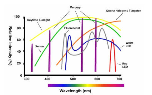 图3.光源相对强度与光谱内容(底部的条表示近似的人类可见光波长范围)