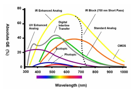 图4.相机传感器绝对量子效率与波长(底部的条表示近似的人类可见波长范围)