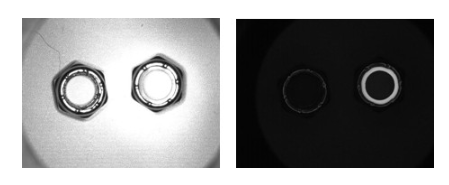 图5.左图显示的是带有紫外环光的nyloc螺母,但充满了660 nm的“环境光”。 目标是确定尼龙的存在/不存在。 由于周围环境的贡献很大,很难从样品的相对低产量的蓝色荧光灯中获得足够的对比度。 正确的图像具有相同的光照,除了相机镜头上安装了510纳米的短通滤波器,可以有效地阻挡红色“环境”光线,并允许蓝色450纳米光线通过。