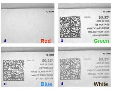 图9.在(a)红光,(b)绿光,(c)蓝光下产生的邮件图像,产生的对比度比绿色低,(d)白光,对比度比蓝色或绿色少。 白光对比所有颜色,但可能是对比度的妥协。