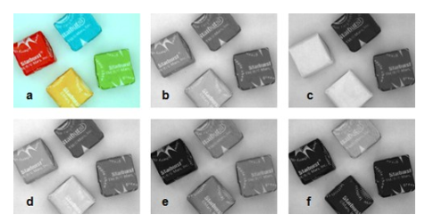 图10.糖果碎片在(a)白光和彩色CCD照相机,(b)白光和黑白照相机,(c)红光下照亮,使红色和黄色都变亮并使蓝色变暗,(d )红光和绿光,产生黄色,比黄光更亮,(e)绿光,绿光和蓝光,使红光变暗,(f)蓝光,使蓝光变亮,使其他光线变暗。