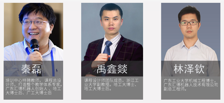 1、豪华师资,师资阵容强大,由哈工大博士,广东汇博机器人创始人秦磊博士、浙江工业大学副教授禹鑫燚、广东工业大学博士林泽钦等组成的教学研发团队。