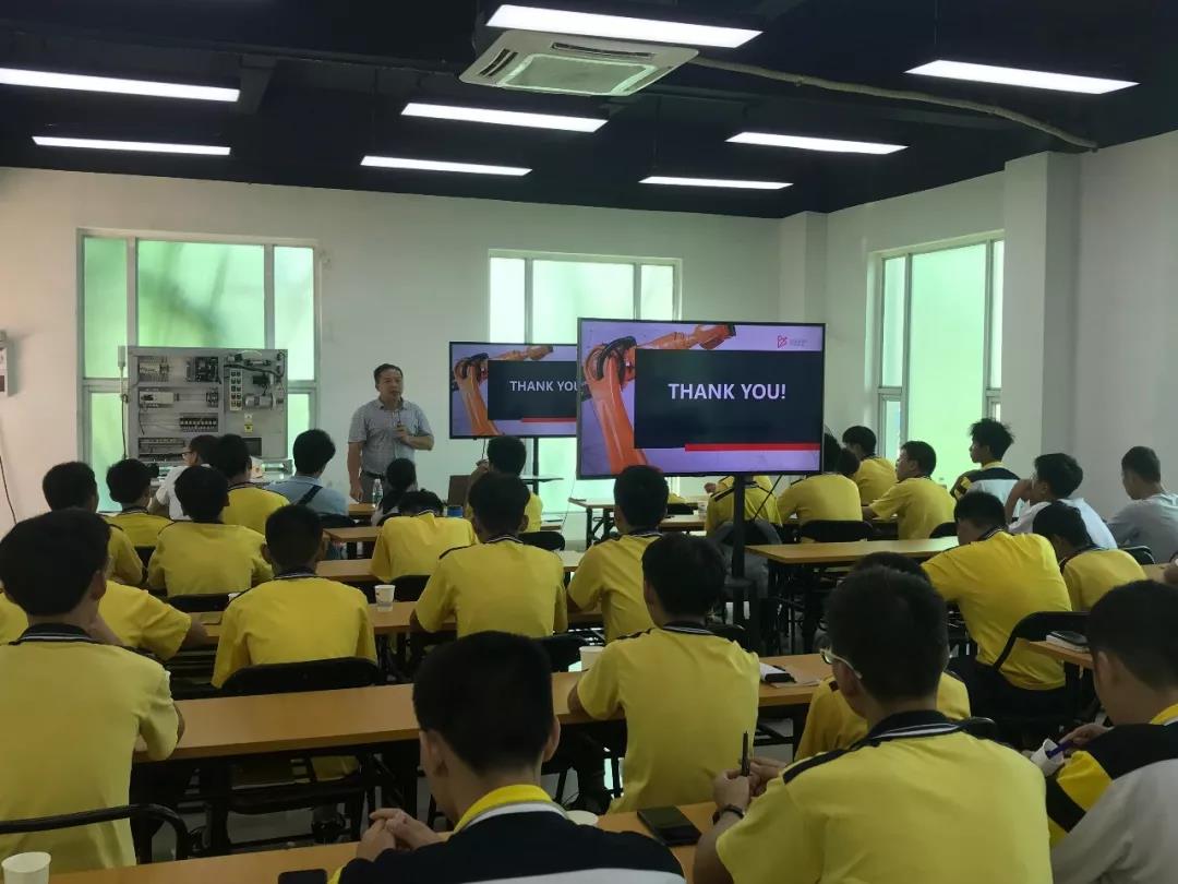 告别生产车间,同学们来到了丝瓜视频污版在线观看机器人培训中心实训大厅,在这里,大家更能深刻的认识到丝瓜IOS视频下载的结构、机器人动作方式、机器人周边设备和工控实训平台等重要内容和设备。工控实训平台是机器人的中控中心,也是机器人联调联试以及机器人与周边辅件相互配合的平台。而在实训中心讲到的关于机器人的众多知识点,都是佛山市实验技工学子们未来将要学习和掌握的,同学们听得都非常认真。