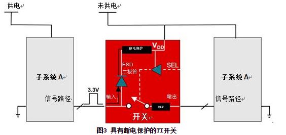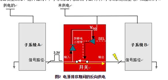 与图1对比,来自子系统A的3.3V信号为内部静电放电二极管反向供电,从而接通开关。这将关闭通往子系统B的信号路径,使信号从开关中(黄色箭头)漏出,从而出现错误的逻辑状态,这可能会损坏子系统B并中断系统启动。