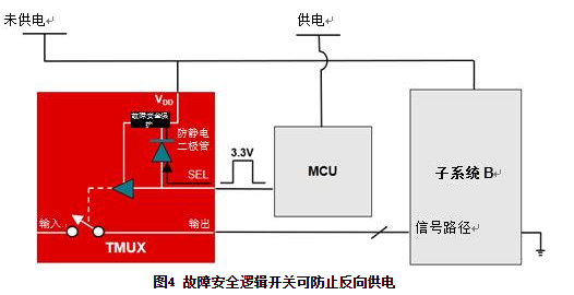如同断电保护隔离电源轨和I/O信号路径的方式一样,故障保护逻辑隔离电源轨和SEL管脚逻辑信号,如图4所示。