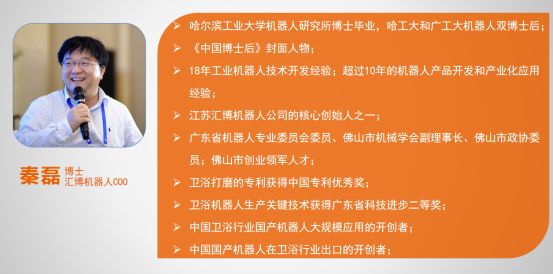 作为智能制造领域颇具影响力的领军人物,秦博士师承中国工程院蔡鹤皋院士、国家863计划先进制造领域专家孙立宁教授;哈工大和广工大机器人方向双博士后,多次获得国家级及省级科技进步奖,是中国国产机器人在卫浴行业出口的开创者。