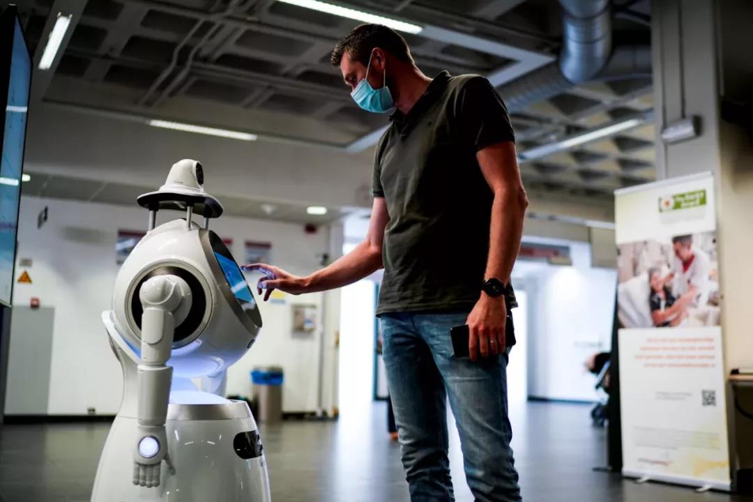 例如,在比利时的安特卫普大学医院,机器人已经占据了医疗保健一线的位置。携带粗短胳膊和躯干的儿童大小的机器人迎接来院的怀疑自己患有COVID-19的患者。