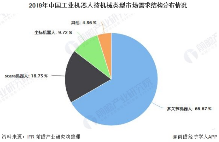 从机械结构看,2019年多关节机器人在中国市场中的销量在各机型中依然位居首位,全年销售近9.6万台,占总销量的66.67%,销量同比下降2.3%,是自2013年来销量首次出现同比负增长;