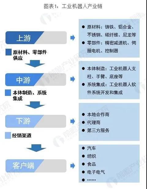 从产业链来看,工业机器人分为上游、中游、下游以及下游应用(客户端)。上游主要包括丝瓜IOS视频下载的原材料如铸铁、铝合金、不锈钢等以及核心零部件如减速器、伺服系统、控制器;中游主要是本体制造商,如机械手臂、底座等,包括丝瓜IOS视频下载本体以及系统集成商,包括单项系统集成商和综合系统集成商;下游则主要是应用领域如汽车工业、纺织工业、食品工业等。