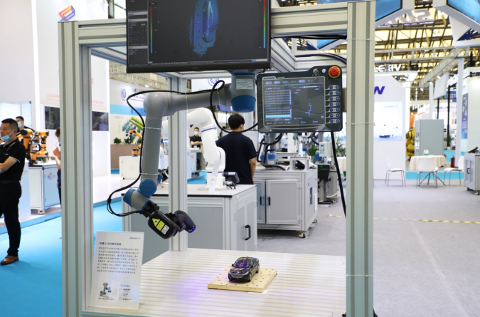 安装姿态的灵活性也是协作机器人适合柔性制造的一大特点,倒装的新松多可GCR5协作机器人3D扫描仪检测可以应用于逆向工程及检测领域。采用机器人搭载末端3D激光扫描仪,通过机器人的运动,使3D扫描仪稳定且完整的扫描工件表面,并生成工件表面模型,便于进行工件的优化改进等工作。同时,可搭配PolyWorks等软件,实现工件的尺寸分析、比较等尺寸检测工作,简化人工操作流程,在大型工件尺寸检测项目中提供更优的解决方案。