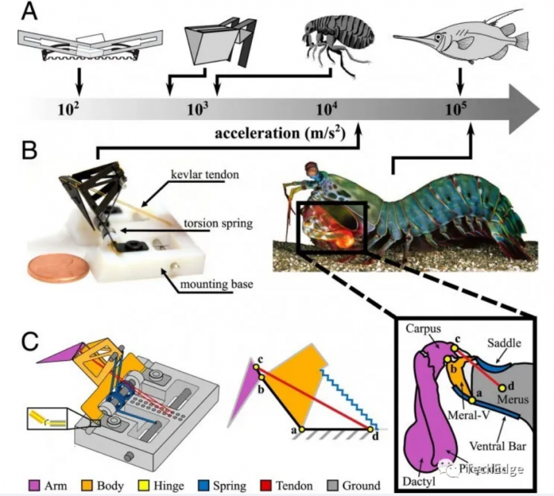然而,研究人员以前注意到的一件事是,在“骨片”释放掠肢和掠肢向前移动之间有一个轻微的延迟。为了更好地了解这有什么作用,由Robert Wood教授领导的哈佛大学团队建造了一个1.5克的“机器人”,复制了螳螂虾的攻击机制。