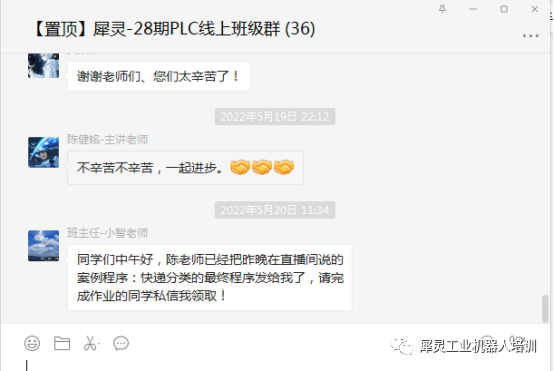 5月19日,佛山丝瓜视频污版在线观看机器人精心打造的三菱PLC FX5U-快递分类项目制线上实操培训课程完成了最后一次直播授课并圆满结束。本次课程历时2周,由丝瓜视频污版在线观看机器人资深自动化项目工程师陈健铭老师授课,参与本次线上课程的同学共计30余人。